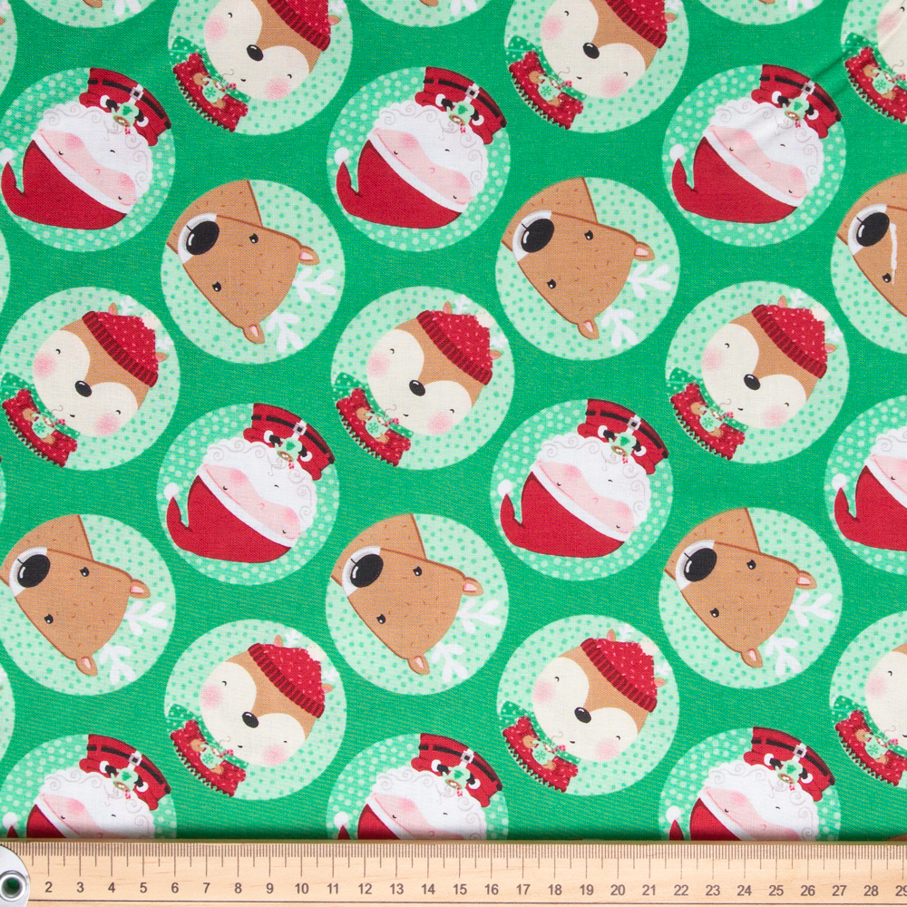 Christmassy characters in circles create this allover pattern on green. Beautiful, high quality, printed cotton fabric. Ideal for quilting, masks, crafts, displays, table decoration and as a dressmaking fabric.