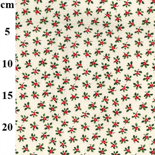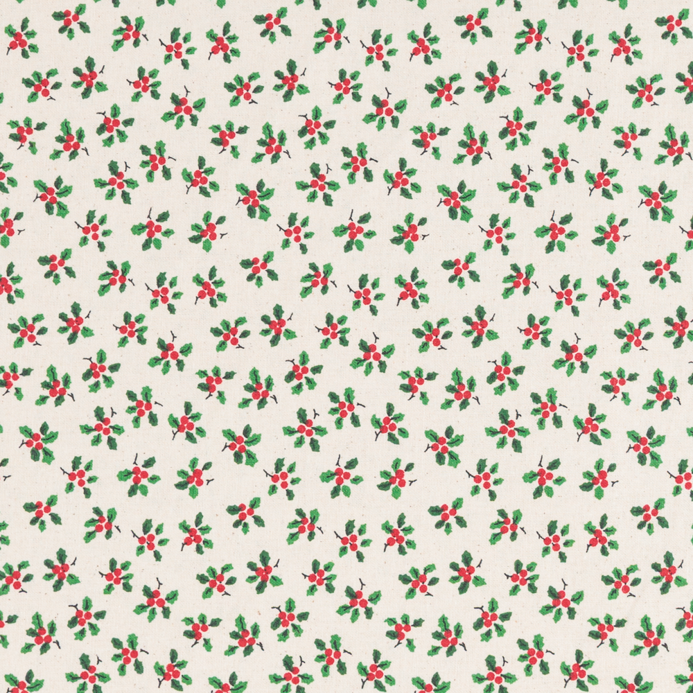 Holly leaves and berries create this allover print on ivory. Beautiful, high quality, printed cotton fabric. Ideal for quilting, masks, crafts, displays, table decoration and as a dressmaking fabric.