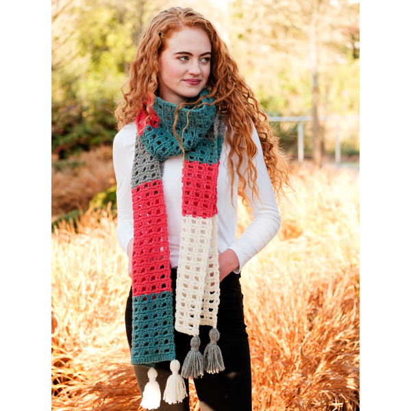 Our Shayla Colourblock Crochet Scarf has been designed for us by Carmen Heffernan. This scarf has been crocheted using 4 solid shades from our Vale collection.