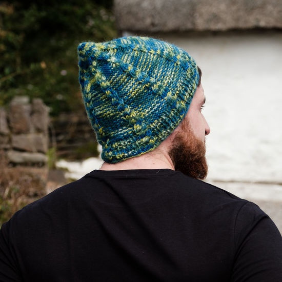The cables in our Cassidy hat run from the brim to the crown. Tralee based Daniel Griffin has designed a beautiful cabled hat for Yarn Vibes. He has included a 1 x 1 rib to the brim to ensure a snug fit. This pattern is suitable for both men and women. The colours that can be seen in his finished hat and the matching Aidan mittens are always close to Daniel when he is knitting outdoors by the lake. The shades of greens and blues that can be seen are ever-changing but also ever-present.