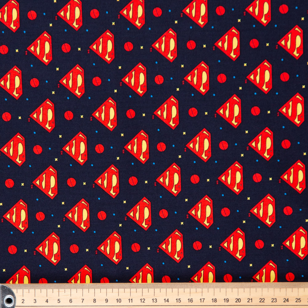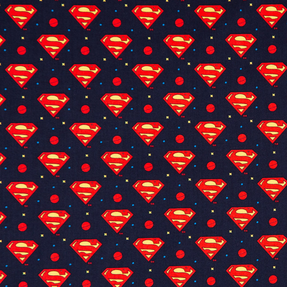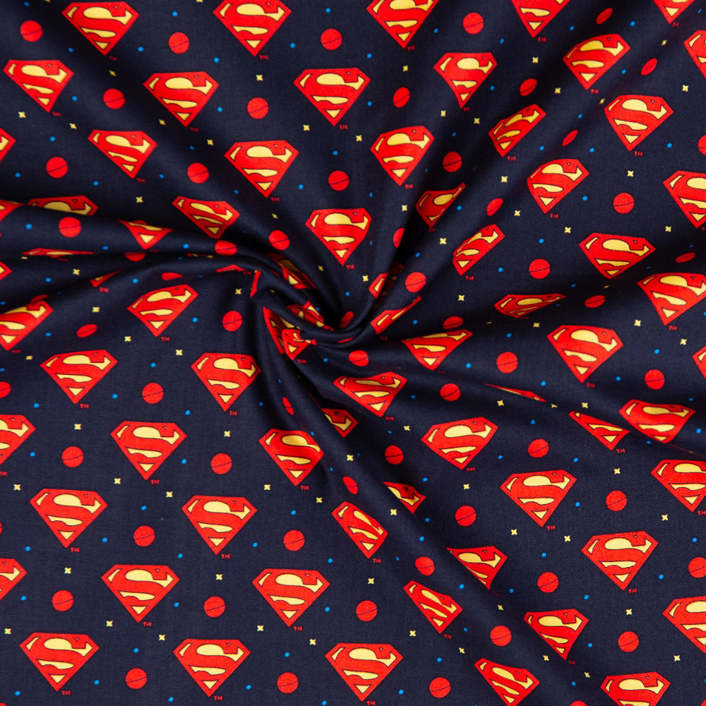 Patterned fabric with Superman logos. Beautiful, high quality, printed cotton fabric. Ideal for quilting, masks, crafts, displays, table decoration and as a dressmaking fabric.